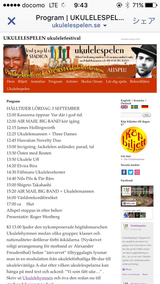 カテゴリーなし 北欧はスウェーデンのウクレレフェスティバルに向かっています。 2016.09.02 さてスウェーデンはストックホルムのウクレレフェスティバルに向かっています。 プログラムに名前が出ています^_^ プログラムにも名前がでてます。 9月3日の15時からストックホルムも古いオリンピックスタジアムです。 ヘルシンキにて乗り換え。 綺麗な空ですね〜^_^ CONTACT Name:お名前 E-mail Message/ ご用件 Confirm/ 送信確認 上記送信内容を確認したらチェックを入れてください SEND/送信 < Prev 一覧へ Next >