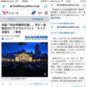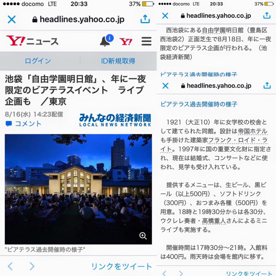 ヤフーニュースに掲載 8/18 自由学園明日館ビアテラス