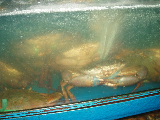 カニの水槽、貝の水槽、大養殖水槽にじゅうたんの5枚重ね のように敷き詰められた魚介類と水槽の壁。